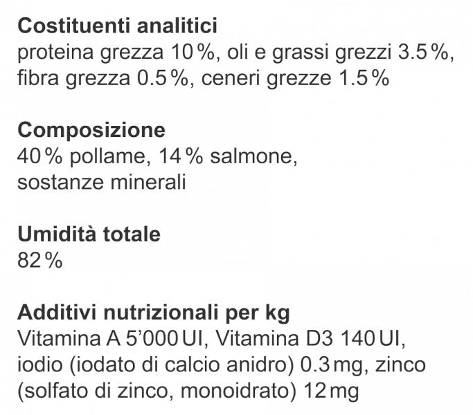 In linea generale vale: un cibo di alta qualità per cani e gatti si riconosce da una lista ingredienti trasparente e da additivi ben motivati. Più la lista ingredienti è chiara e comprensibile, meglio si può valutare la qualità del cibo.